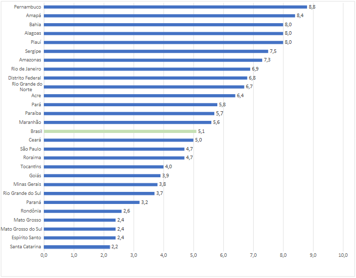 Ante o trimestre anterior, a taxa de desocupação recuou em seis unidades da federação: São Paulo (0,5 p.p.), Rio de Janeiro (0,6 p.p.), Pernambuco (1,2 p.p.), Distrito Federal (1,2 p.p.), Paraíba (1,3 p.p.) e Ceará (1,4 p.p.), com estabilidade nas demais.