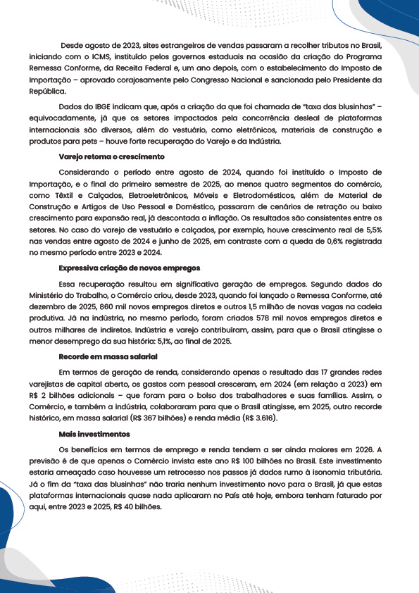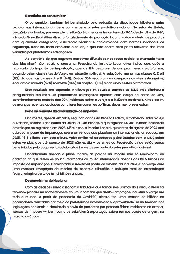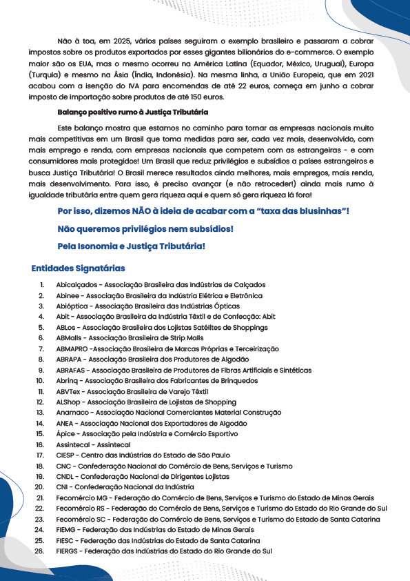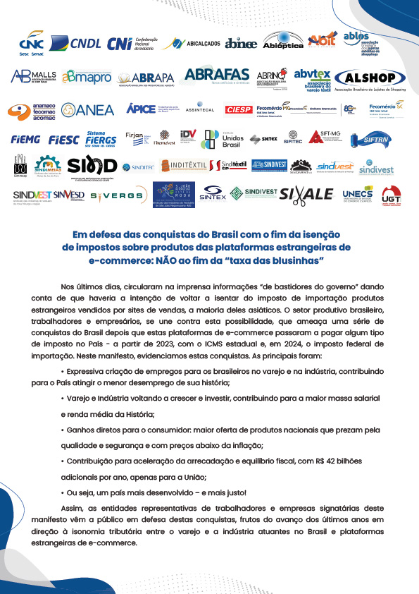 O Sinditêxtil-SP integra o grupo de entidades representativas de trabalhadores e empresas signatárias de manifesto em defesa das conquistas alcançadas com o fim da isenção de impostos sobre produtos das plataformas estrangeiras de e-commerce, conhecida como “taxa das blusinhas”. As ações são fruto do avanço dos últimos anos em direção à isonomia tributária entre o varejo e a indústria atuantes no Brasil.
