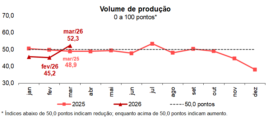 Os empresários industriais paulistas sinalizaram aumento do volume produzido em março (52,3 pontos), com base nos dados da Sondagem Industrial realizada pela Fiesp em parceria com a CNI. O resultado foi 7,1 pontos superior ao registrado em fevereiro (45,2 pontos) e 3,4 pontos maior que março de 2025 (48,9 pontos). Leituras acima dos 50 pontos indicam elevação da produção no mês.